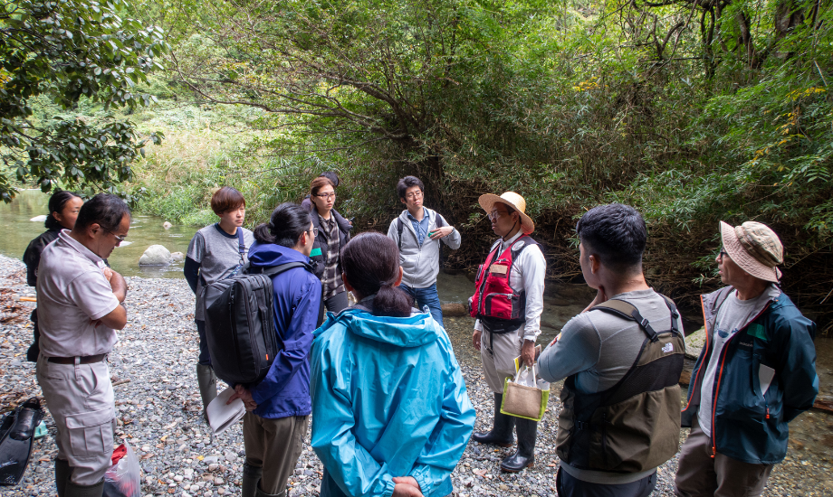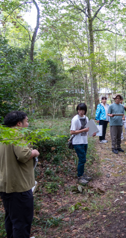 「参加者たちにはまず、川のそばに広がる森『河辺林(かへんりん)』へと足を踏み入れてもらいます。そこには単なる自然だけでなく、かつての人々が水害から暮らしを守るために築いた『猿尾(さるお)』という石積みの堤防が、静かに佇んでいます。専門家の解説を聞き、この場所が守ってきた歴史の営みの重さに触れる時間を設けました」