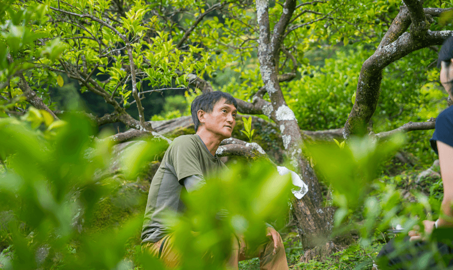 尾鷲港からの山道を車でグイグイ上がっていくと、そこには尾鷲湾を一望する甘夏畑が。甘夏の木の下で、甘夏のコンテナを椅子代わりにしてお話を伺いました。尾鷲湾からの潮風が山を駆け上がり、気持ちの良い風が体を包みます。