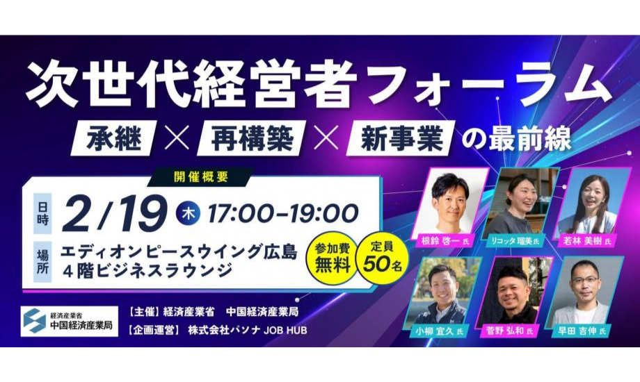 2026年2月19日、中国経済産業局の主催で開催された「次世代経営者フォーラム」には、家業を承継し、地域で活動する5名のアトツギ(後継者・後継予定者)が集まりました。本記事では、5名のアトツギの目線から新規事業への取り組みにおけるリアルな葛藤や試行錯誤の先で見つけた気付きをお届けします。