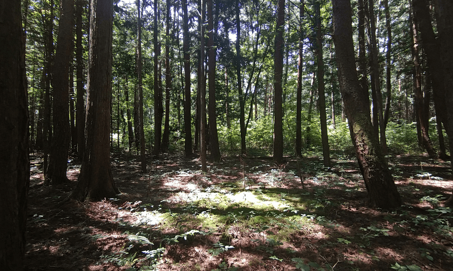 伊那市の山々に広がる森は、一見すると緑豊かに見えます。しかし、その多くは40〜50年前に植えられた木が伐採されないまま放置され、土壌の力が弱まりつつあるといいます。