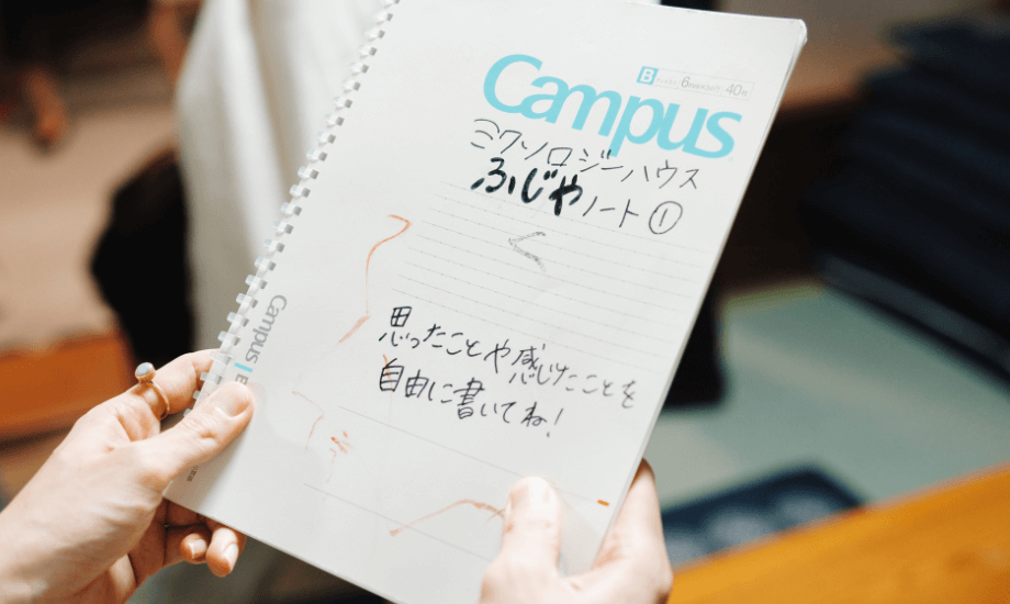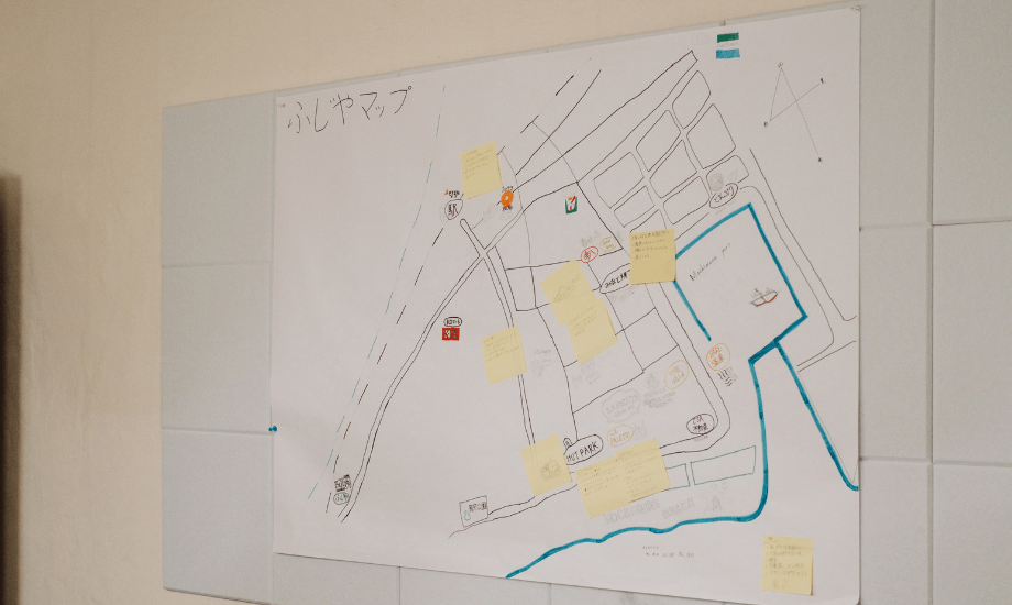ふじやの中には、地域の中学生と一緒に手作りした地図や、利用者なら誰もが書き込める感想ノートがあります。地域の人の存在感が宿の中に自然と溶け込んでいました。
