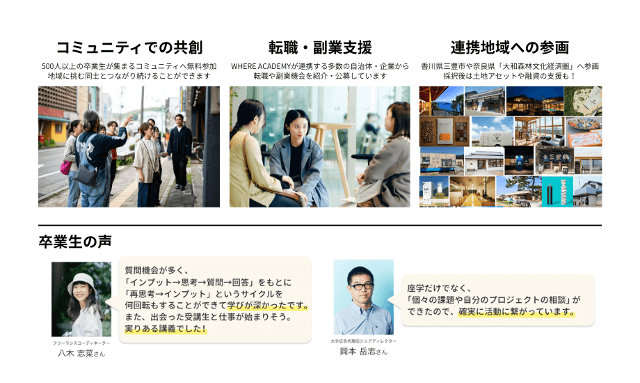 A. WHERE ACADEMY卒業生コミュニティへの招待のほか、講師企業からの副業・求人情報の提供、三豊市・奈良での起業支援(審査あり)などの機会があります。