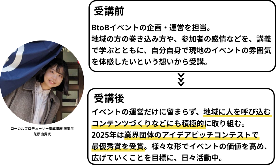 「経験豊富で面白い取り組みをしている講師たちばかりです。そうした講師から、『地域と関わるとは具体的に何か』『そもそもなぜ地域と関わりたいのか』という本質を学べるのは、間違いなくこのローカルプロデューサー養成講座だと思います」