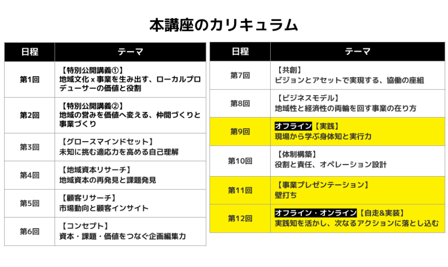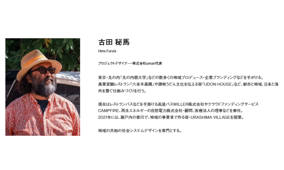 香川県三豊市で40社以上の事業を生み出してきたプロデューサー古田秘馬さんや、奈良で「大和森林文化経済圏構想」を推進する澤田哲也さんなど、地域を舞台に活躍する実践者が講師を務めます。20〜30年にわたる経験の中で積み重ねてきた成功や失敗をもとに、机上の理論ではなく「地域で事業をつくるリアル」を伝えています。