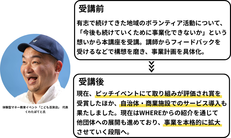 現場に根ざしたリアルな学びを通じて、自分の現在地や地域との関わり方、これから挑戦したい事業の方向性が具体的に描けるようになります。そして何より、地域で活動する講師たちが「地域に関わること」を楽しんでいる姿そのものが、受講生にとって大きな刺激に。