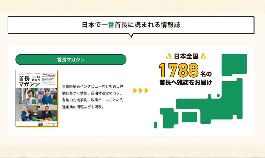 その中心にあるのが、全国の自治体の首長を読者とする専門メディア「首長マガジン」です。47都道府県知事と1741市区町村長と、その経験者に届けられています。